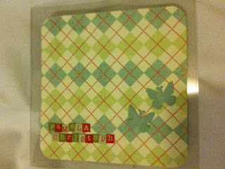 Das ganze "Sentiment" mit Mini-Alphas geklebt und dann mit Glossy überzogen, weil sie nicht so stark hafteten. Ins noch feuchte Glossy ein paar gepunchte Schmetterlinge (hatte ich noch übrig von der Bordüre von der oben gezeigten Karte).